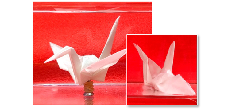 当浸入水中时,有Choetsu涂层的纸鹤(左)保持原来的形状,而普通纸鹤(右)很快就被水浸透并开始分解。图片来源:Zenji Hiroi