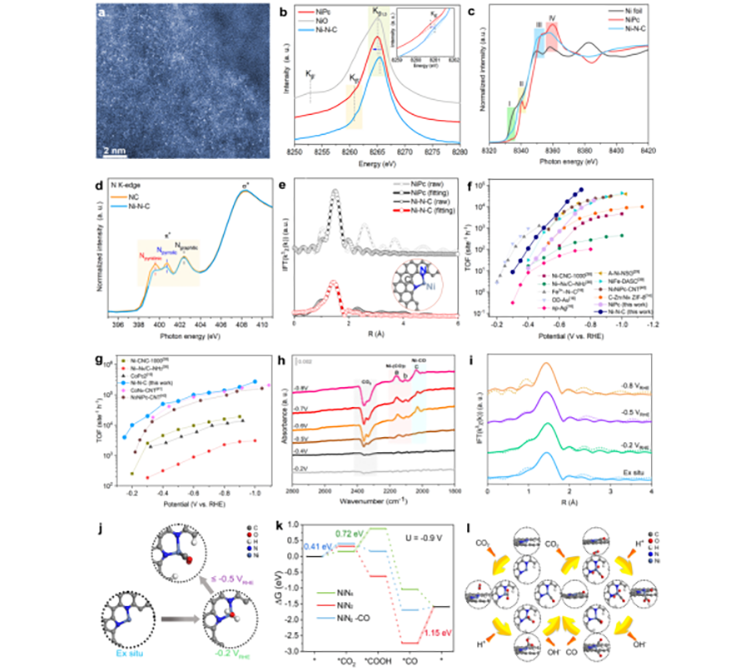 理论计算研究也表明,在电化学过程中形成的单一氧化碳吸附镍单位点上能够更好地实现关键中间体形成和一氧化碳脱附之间的平衡,这是催化剂高的催化活性的重要起源,从而很好地揭示了其在二氧化碳电还原反应中的催化机理。