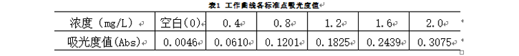 管路清洗完成后,点击“开始测量”,进样针在操作系统控制下会自动进行系统清洗,标准空白测量以及各个标准点测量。为了减少工作量以及人为操作误差,本次实验工作曲线采用“单点定标”方式,即通过控制样品泵转速来精准控制标准品进样量,从而达到只需配制单一标准点,即可完成多点工作曲线的绘制。本次实验采用“单点定标”,标准点浓度依次为0,0.4,0.8,1.2,1.6,2.0mg/L。根据测量所得吸光度,软件系统自动绘制工作曲线。工作曲线各标准点测得浓度如表1所示,其线性回归方程为 y=0.1542x-0.0020,相关系数r=0.9999。结果表明,气相分子吸收光谱仪灵敏度高且具有良好的线性相关性。