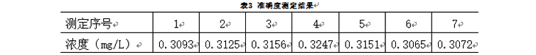 用国家标样品(浓度为0.318±0.018mg/L)进行7次平行测试,准确度见表3。测试结果表明,准确度较好。
