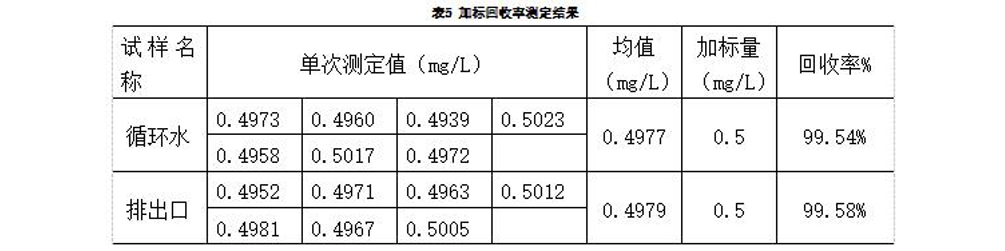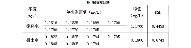分别取循环水以及排出口废水实际试样进行精密度测试以及加标回收率测试,所得数据见表4、表5。