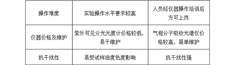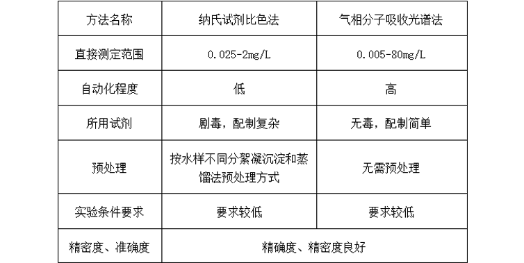 从样品前处理,所用试剂,自动化程度,操作难度以及抗干扰性等方面将气相分子吸收光谱法与纳氏试剂法相比较,列表见表6所示。