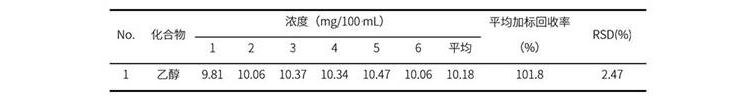 使10mg/100 mL的标准添加血液样品测试回收率,平行6份,乙醇平均加标回收率为101.8%,RSD为2.47%。