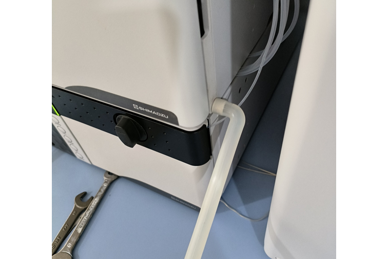 由于二氧化碳输液泵泵头冷却长期默认设置为5摄氏度低温状态,在环境湿度较大时,更容易产生冷凝水附着在冷却液循环管路外壁、泵头温度传感器等位置,影响整体冷却效果,导致温度传感器误报警等情况。所以必须保持环境湿度低于60%,同时在如图位置正确连接废液管路,以便于冷凝水的正常排出。