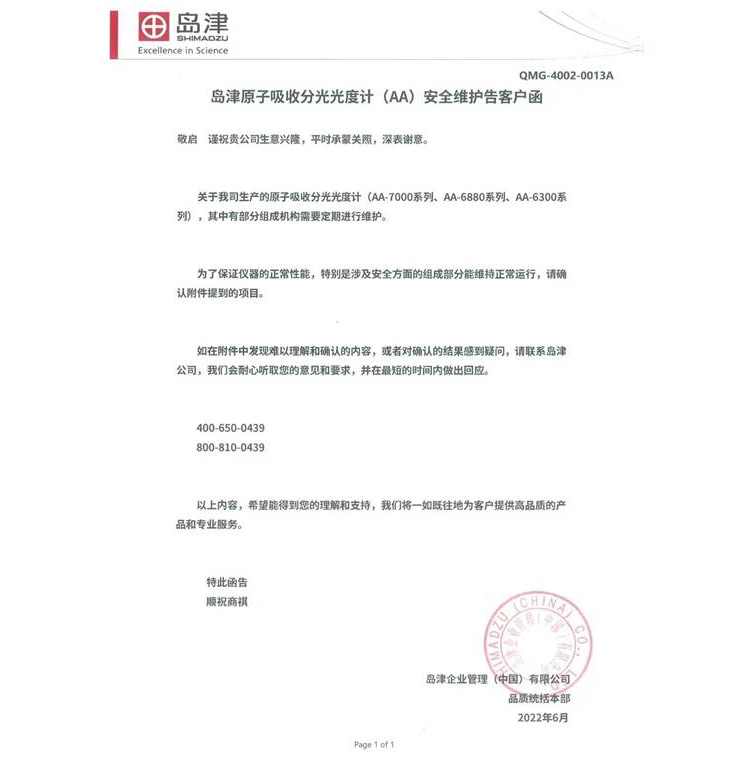为了确保仪器的正常运行,特此我公司提供《岛津原子吸收分光光度计(AA)安全维护告客户函》及《AA安全维护项目一览表》,它将告诉您怎样安全维护岛津原子吸收分光光度计。