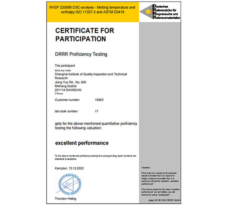 近日,上海市质量监督检验技术研究院参加由德国标准物质局(DRRR)组织的“熔点和热焓的测定”国际能力验证获满意结果。