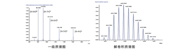 岛津四极杆飞行时间质谱 LCMS-9030具有高分辨率、高质量数准确度和媲美三重四极杆灵敏度的特点,可以准确测定寡核苷酸分子量。寡核苷酸分子带负电,通常使用ESI负离子模式检测,在质谱图上常观测到一系列的多电荷离子,需要进行解卷积处理,得到寡核苷酸分子量。