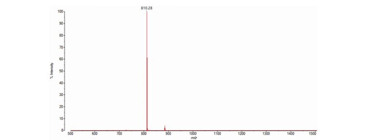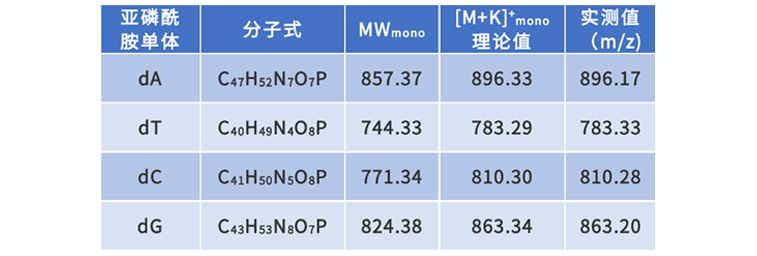 采用MALDI-8030测定了四种亚磷酰胺单体的分子量,在线性正离子模式下,均检测到显著质谱峰,质荷比大小与钾离子加合峰相符。MALDI-8030体积紧凑、分析速度快、维护方便,是寡核苷酸样品分析的有力工具。