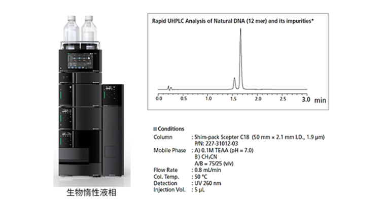 使用生物惰性液相Nexera XS Inert结合Shim-pack Scepter C18色谱柱进行了寡核苷酸样品的快速纯度分析,寡核苷酸和其杂质分离良好。即使在50℃高温、0.1M TEAA的盐浓度条件下分析,也表现出良好的稳定性。基于有机杂化颗粒硅胶技术的Shim-pack Scepter C18,适合用于寡核苷酸纯度以及杂质分析。