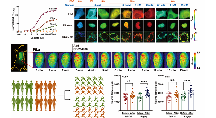近年来越来越多的研究表明,乳酸在多种生理和病理过程中发挥了关键作用,不仅是重要的能量燃料和生物分子的合成砌块,而且能够通过直接调控蛋白相互作用和乳酸化修饰,影响细胞信号转导、基因表达调控、肿瘤和免疫代谢等过程。然而,由于缺乏面向在体和活细胞的乳酸时空分辨监测技术,有关乳酸代谢的一些重要生物学问题仍未能解决。为此,研发团队原创了系列高性能的乳酸荧光蛋白探针FiLa,揭示了乳酸在代谢、自噬、衰老和肿瘤等生理和病理过程中的重要作用。