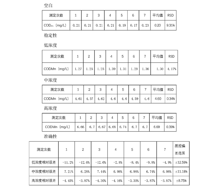 测定重复性:RSD≤2.0% (高锰酸盐指数值为4mg/L的葡萄糖标准溶液);