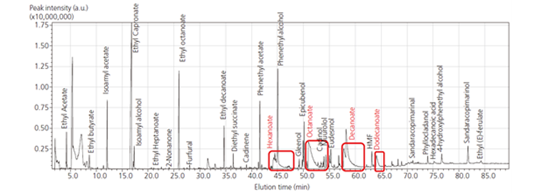 岛津提供基于AOC-6000 Plus多功能自动进样器和GCMS-TQ8050 NX联用的系统平台,通过采用具有更大承载能力的SPME Arrow技术、调整样品pH值的方法不仅获得了更高的萃取效率和灵敏度,同时也降低了脂肪酸对共流出组分出峰的影响,建立了含酸量较大的食品中挥发性成分的分析方法。该方法自动化程度高,大大简化了样品的前处理过程,同时萃取效率高,为复杂样品的分析提供了一种很好的手段。