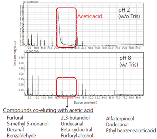 以上建立的方法在另一个应用中得到了验证,采用顶空固相微萃取的方式对含有大量醋酸的苹果醋进行分析,添加Tris调节pH值后醋酸出峰明显减小,多种之前共洗脱的组分被很好的分离(如下图3),进而验证了该方法的可行性。