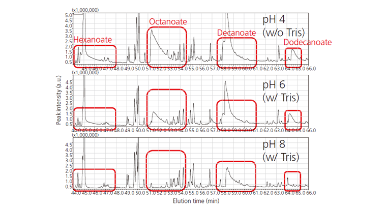 在清酒样品中加入难挥发的三羟甲基氨基甲烷(Tris)溶液来调整样品的pH值,使用直接浸入式SPME提取(萃取纤维头PDMS),对原始样品及不同pH值下的样品进行对比分析,结果见图1和图2。从结果中可以清晰的看到调整样品pH前己酸、辛酸、癸酸、十二酸等脂肪酸的色谱峰较大,并出现了严重的拖尾现象,干扰了其他共流出组分的出峰,随着pH值的增大脂肪酸的色谱峰明显减小,部分与其共流出的组分获得了很好的分离和检测效果。
