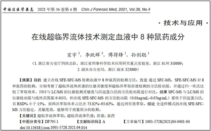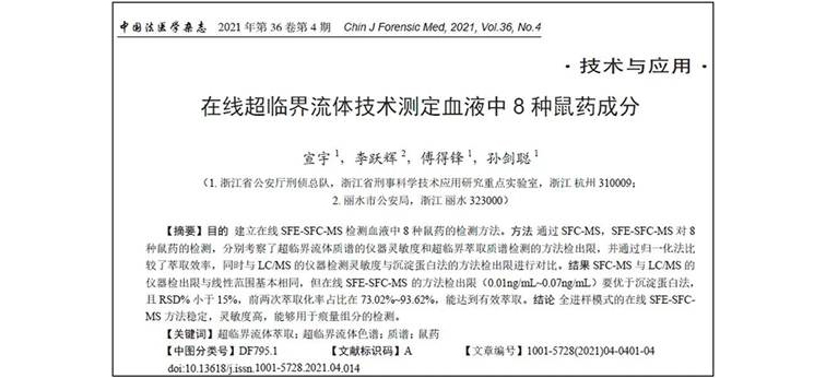 近期,浙江省公安司法鉴定中心采用在线超临界流体技术Online SFE-SFC-MS 系统建立了血液中8种鼠药的在线超临界流体提取检测方法,简化了血液样品的前处理过程,具有使用溶剂少、需要样品量少、绿色环保的特点,并实现了样品提取检测的全程自动化,相关成果发表在《中国法医学杂志》期刊上。
