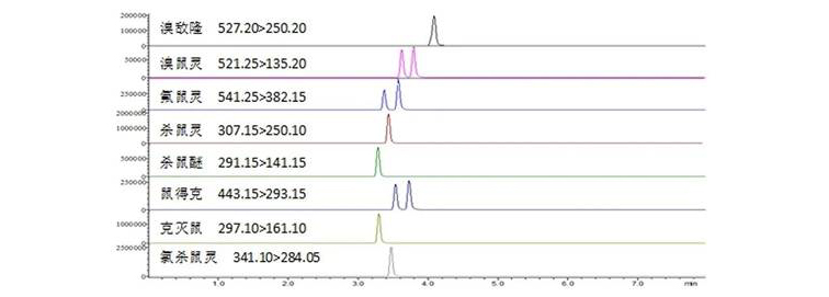 溴敌隆等8种抗凝血类鼠药的MRM色谱图如图3所示,目标组分峰形良好,且溴鼠灵、氟鼠灵、鼠得克等手性化合物的异构体可以实现基线分离,可见,SFC较适宜用于手性物质分离,目前已有相关研究报道SFC正成为拆分对映异构体的首选。