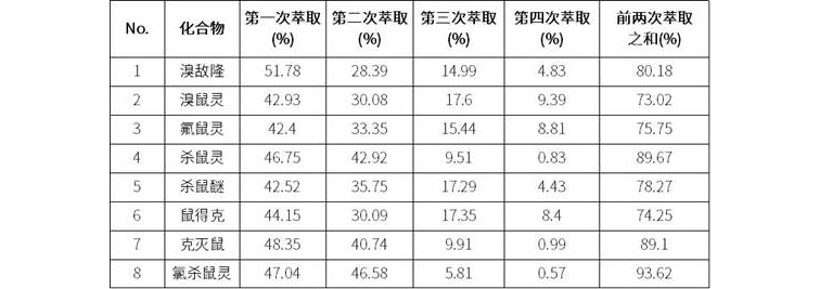 为考察SFE对各组分的萃取效率,通过重复对同一萃取罐内样品连续四次在线SFE-SFC-MS联用分析,以每次萃取所得的鼠药峰面积与四次萃取峰面积和的比值表示归一化萃取率。结果表明:前两次萃取的效率较高,各组分前两次的萃取率之和在73.02%~93.62%之间,基本可以满足实验要求。因此,后续实验时,SFE的萃取次数固定为两次。