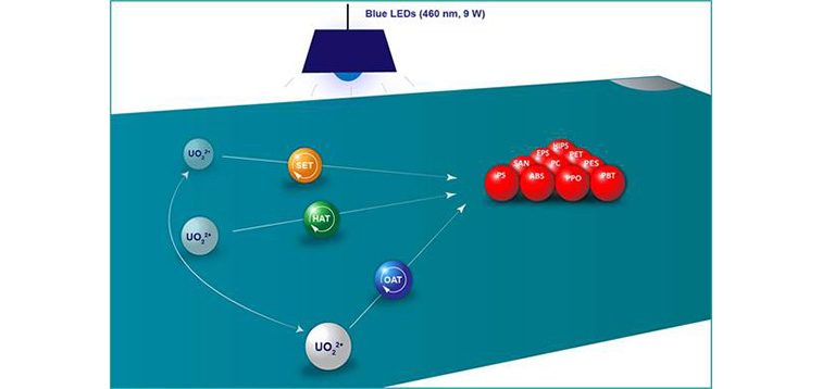以六水合硝酸铀作为光敏剂,在460纳米蓝光照射下,聚苯乙烯可以30%的分离产率获得苯甲酸;聚苯乙烯泡沫可以40%产率降解为苯甲酸;高抗冲聚苯乙烯(HIPS)可以32%的收率降解为苯甲酸。公斤级真实聚对苯二甲酸乙二醇酯(PET)瓶(未清洗、含水、色素、黏合剂、添加剂)能够在2天内以88%的产率降解为对苯二甲酸。