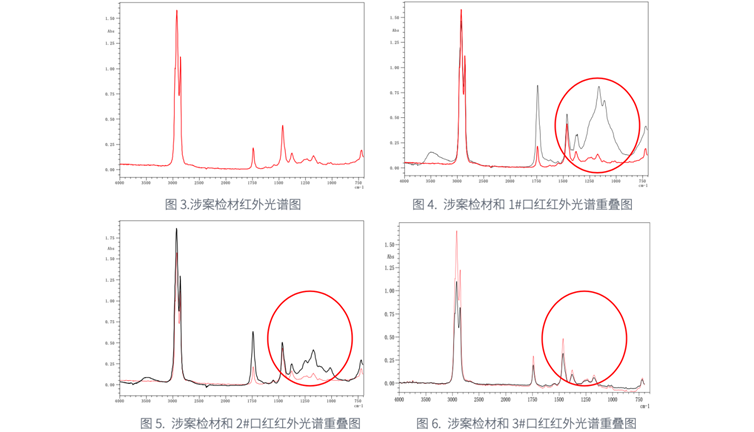 实验结果表明,疑似物证1#和2#样品与涉案口红检材的红外谱图峰位和峰形在1600~700cm-1范围内存在明显差异,排除该口红主人作案嫌疑。而疑似物证3#与涉案口红检材谱图一致,嫌疑人锁定。“让口红开口说话”按迹寻踪,案情最终水落石出!