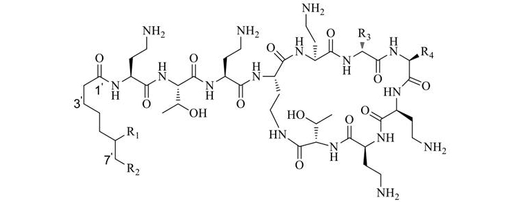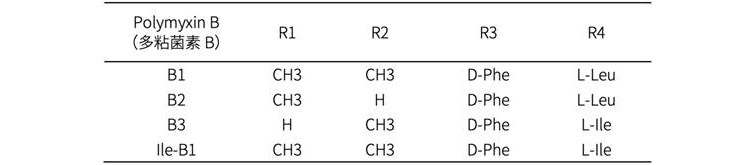 多黏菌素B( Polymyxin B,PMB)于1947 年在多黏类芽孢杆菌( Bacillus polymyxa) 中发现,是一种五价阳离子型(含5个α, γ--二氨基丁酸)十肽抗生素,由N-端脂肪酰基链、线性三肽、环状七肽构成,对革兰氏阴性杆菌有强效杀菌作用,但由于具有较高的肾毒性,只能局部( 耳、眼) 用药。PMB为发酵的混合型多肽类抗生素,组分种类较多,目前已发现的组分超过30种,其中占比较高的四种主要组分包括B1、Ile-B1、B2、B3。这四种组分组成氨基酸包括亮氨酸、异亮氨酸、苯丙氨酸、苏氨酸、二氨基丁酸,结构通式及信息表见下。