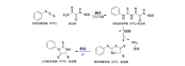 目前对多黏菌素B结构的研究主要为氨基酸组成成分、氨基酸构型分析等,氨基酸序列的研究报道较少。氨基酸序列是其能否正确发挥生物活性的重要基础,岛津与上海药检所合作开发了应用蛋白质测序仪对多粘菌素B进行氨基酸序列分析的方法[1]。蛋白质测序仪执行全自动化的Edman降解反应,从N端开始测定每个位点的氨基酸种类。本研究以B2组分为例,对其进行分离纯化和酶解后,获得去除N-酰基脂肪链及1位二氨基丁酸的肽链,解除了N端封闭,通过蛋白质测序仪PPSQ-53A测定其氨基酸顺序。