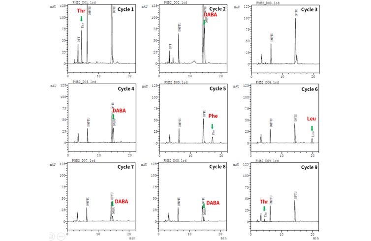 Edman降解法是进行N端氨基酸序列分析的经典方法,岛津以其为原理设计的全自动蛋白质测序仪(以下简称PPSQ),由液相系统和可执行自动化Edman降解反应的主机组成,将氨基酸从多肽链的N端依次切割下来,通过色谱的保留时间判定氨基酸种类,结果直接可靠。PPSQ除了测定标准氨基酸外,还可以测定非标准氨基酸。多粘菌素B中含有非标准氨基酸α, γ--二氨基丁酸(DABA),可通过标准品出峰时间的测定与其他标准氨基酸一起进行氨基酸种类的鉴别。