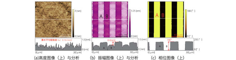 图7. BaTiO3的(a)高度图像、(b)相位图像、(c)振幅图像