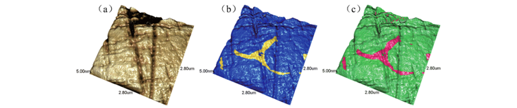 另外,对于极化域分布无规律的BaTiO3样品,可以采用相同的测试方法来捕捉其微观区域的极化域分布情况,测试结果如图7所示。从图7(a)的3D高度图像中可以直观地观察BaTiO3的表面形貌,但无法了解其极化域的分布情况。图7(b)相位图像是叠加显示在3D高度图像上的,可以观察到BaTiO3对施加的交流电压的响应,其中黄色的类“人”字区域表示该区域在电压作用下的伸缩方向与周围部分不同。图7(c)振幅图像也是叠加显示在3D高度图像上的,可以观察到BaTiO3在施加交流电压作用下的伸缩大小,其中粉色的类“人”字区域表示该区域在电压作用下的伸缩量比周围部分小。由此,可清晰捕捉到BaTiO3的极化域的结构。