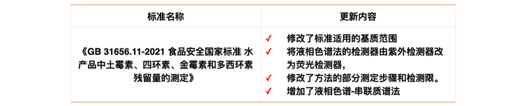 GB 31650-2019 《食品安全国家标准 食品中兽药最大残留限量》中规定了鱼虾中土霉素、四环素、金霉素最大残留限量(MRLs)200 μg/kg,强力霉素MRLs 100 μg/kg。2022年2月1日新实施的《GB 31656.11-2021 食品安全国家标准 水产品中土霉素、四环素、金霉素和多西环素残留量的测定》,对《GB/T 22961-2008 河豚鱼、鳗鱼中土霉素、四环素、金霉素、强力霉素残留量的测定》标准进行了更新,具体见下表。