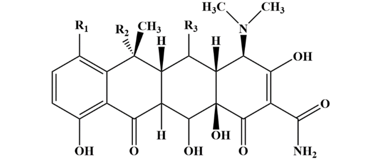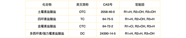 四环素类抗生素的基本结构如下图,含有ABCD四元环,D环含有酚羟基,水溶液显酸性,容易与金属离子形成络合物,因此在一些未经完全惰性化处理的玻璃瓶中会形成吸附,影响分析结果的准确性。在酸性条件下四环素、金霉素易形成可逆的差向异构体,而金霉素在碱性、高温(70℃)条件下易水解,同时四环素类抗生素在光照条件下也不稳定。