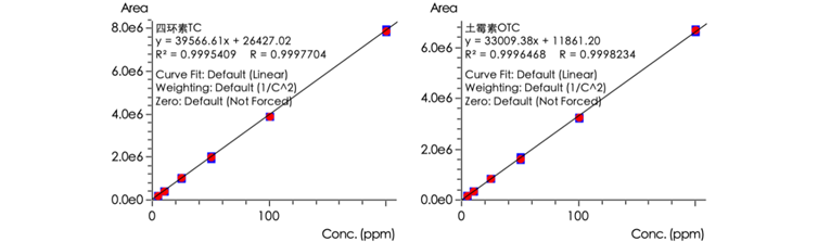 4种四环素类抗生素在5~200 ng/mL范围内,线性良好,相关系数R均大于0.999。