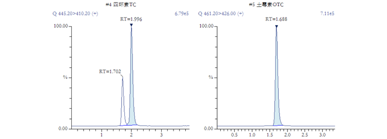 对市售南美白虾进行分析,未检出四环素类抗生素成分,并且在出峰区域无杂峰干扰。以下是在南美白虾样品中添加50 μg/kg四环素得到的加标样品MRM色谱图,4种四环素类抗生素加标回收率70.4%~105.1%之间,符合标准要求。