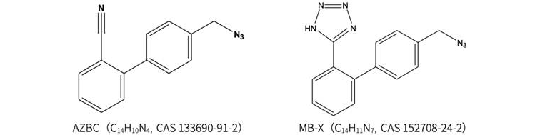 叠氮化合物是医药行业中常见的化工原料,通常作为起始物料、反应试剂或中间体存在于药物合成过程中,在厄贝沙坦的合成中,通常需要使用三丁基叠氮化锡或叠氮化钠以形成药物结构中的四唑环,如厄贝沙坦原料药中的4’-(叠氮甲基)[1,1-联苯]-2-氰基(AZBC)、5-[4’-(叠氮甲基)[1,1-联苯]-2-基]-2H-四氮唑(MB-X),见下图。