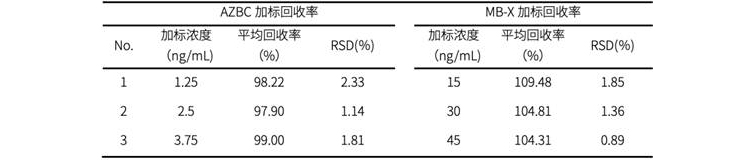 AZBC和MB-X的线性范围分别为0.25ng/mL-25 ng/mL和1 ng/mL-75 ng/mL,且线性回归系数R2>0.999,各标准点校准误差均在±5%以内。