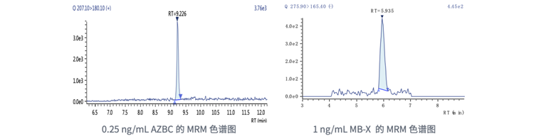 采用岛津超高速LC-MS/MS技术,可分别建立快速、稳定、高灵敏度的叠氮化合物AZBC、MB-X的分析方法。