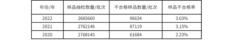 食用农产品为食品安全监督抽检实施细则中三十三大类食品类别之一,是食品从农田到餐桌的初始环节,不仅是食品安全的重要组成部分,更是食品安全的源头;作为食品供应链的前端,食用农产品的安全风险具有更强的覆盖性和复杂性,从2020-2022年国抽食用农产品不合格率可以看到,虽然整体不合格率在4%以下(数据来源:国家市场监督管理总局官网),但每年不合格样品数量仍然很大,在一定程度上影响人们身体健康。