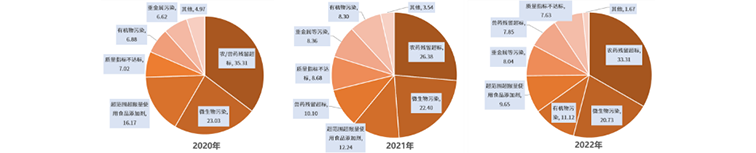 从近三年我国食品安全监督抽检的结果看,食品安全整体状况良好,2020- 2022年抽检整体合格率在97%以上。食品中检出的不合格项目类别主要有农药残留超标、微生物污染、有机物污染、超范围超限量使用食品添加剂,兽药残留超标、质量指标不达标、重金属污染等(具体占比见下图,数据来源:国家市场监督管理总局官网)。
