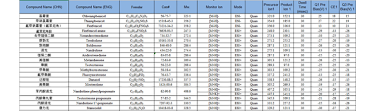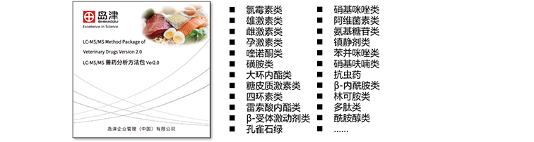 针对兽药残留,岛津推出了的兽药分析方法包,包含30多类570余种兽药化合物,涵盖国家标准、行业标准、农业部公告等多个标准涉及的兽药。方法包中既包括中英文名称、分子式、质量数、CAS号、MRM参数等化合物信息,也有按类别划分的所有兽药化合物的独立方法,用户可根据实际分析需求直接查找化合物参数或调用方法,灵活多变地快速实现多组分同时分析。