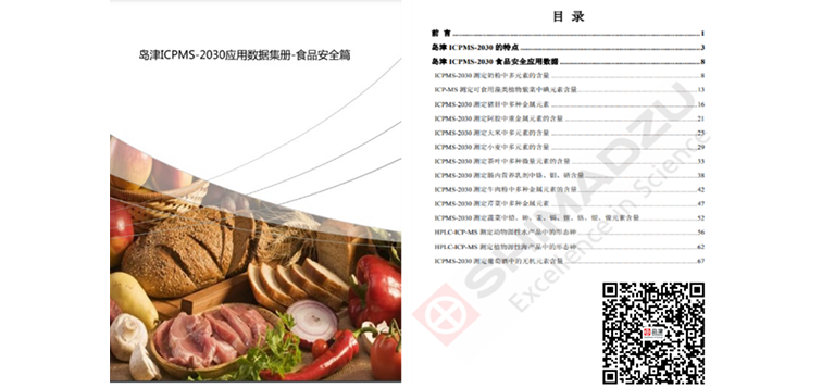 国抽食用农产品涉及到的元素检测主要为铅、镉、汞、砷、铬等重金属的检测,常用的检测方法主要有原子吸收光谱法(AAS)、 电感耦合等离子体发射光谱法(ICP-AES)、电感耦合等离子体质谱法(ICP-MS),其中ICP-MS因具有检出限低、灵敏度高和可同时测定多种元素含量等优点,广泛应用于食品中元素的分析。针对食品中元素分析,岛津已制作《岛津ICPMS-2030应用数据集册-食品安全篇》应用文集,感兴趣的小伙伴们可以扫码下载哦。