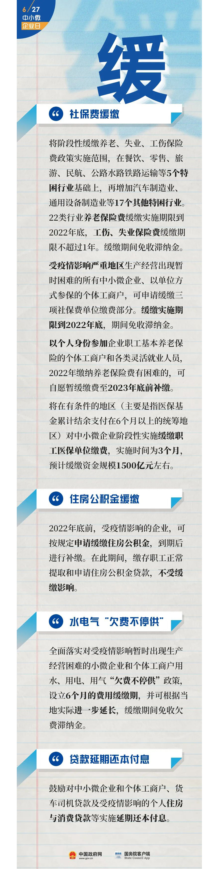 今天(6月27日)是联合国确立的“中小微企业日”。今年以来我国推出多项助企纾困政策措施。哪些钱能减免?哪些钱能退返?哪些钱能缓缴?哪些钱能申领?一起来了解!