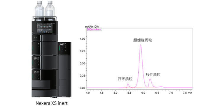 质粒具有3种基本构型:超螺旋(Supercoiled,简称SC)、线性(Linear)和开环(Opencircular,简称OC)。岛津采用生物惰性液相分析3种构型质粒,实现基线分离,可用于超螺旋质粒纯度的测定。