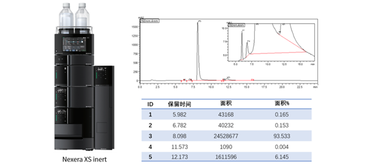 mRNA 纯度对于保障 mRNA 疫苗的有效性和安全性至关重要。由于mRNA中含磷酸基团,在常规液相系统中容易产生金属吸附,从而影响分析的灵敏度、精密度等性能。岛津生物惰性液相系统中管路经peek内衬,整个流路无不锈钢金属材料,从而抑制金属吸附,完美实现mRNA纯度分析。
