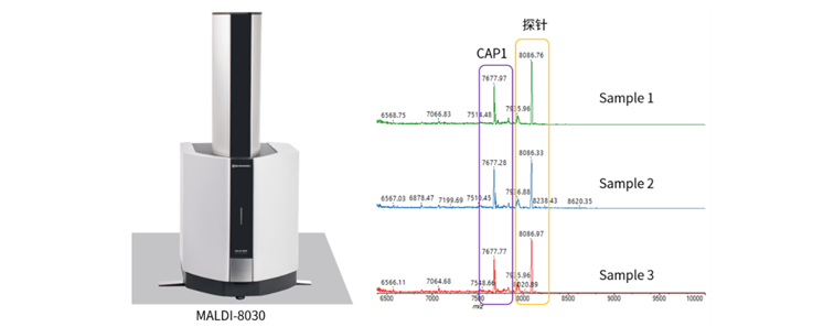 MALDI-8030实物图(左)和mRNA样品加帽后质谱图(右)