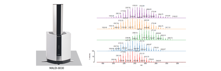 根据中国药典,可采用基质辅助激光解吸附飞行时间质谱(MALDI-TOF)等方法测定LNP成分之一聚乙二醇的重均/数均分子量及多分散性。利用岛津MALDI-8030即可分析PEG分子量。