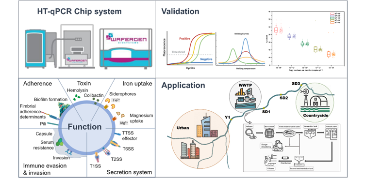 为此,团队基于高通量实时定量PCR技术开发了一种致病菌毒力基因芯片(VFG-Chip),可用于环境中致病菌的毒力组研究。VFG芯片针对环境中4种典型人畜致病菌——肺炎克雷伯氏菌(Klebsiella pneumoniae)、鲍曼不动杆菌(Acinetobacter baumannii)、大肠杆菌(Escherichia coli)和肠道沙门氏菌(Salmonella enterica),覆盖了其中参与编码毒素、粘附因子、分泌系统、免疫逃避/入侵和铁摄取等5种主要功能的96个毒力基因,基于SmartChip高通量实时定量PCR平台,可在2小时内一次性检测42个样品的毒力组,且大于91%的引物扩增效率为90%至110%,具有高效、快速、准确等特点。目前,VFG芯片已成功地应用于城市污水处理系统以及土壤等环境样品毒力组的检测(图1)。VFG芯片为量化环境中致病菌毒力组提供了一种高效可靠的高通量检测手段,未来有望在致病菌毒力组特征及其健康风险与生态风险评估等相关研究中发挥重要作用。团队已为VFG芯片及其应用申请了发明专利。