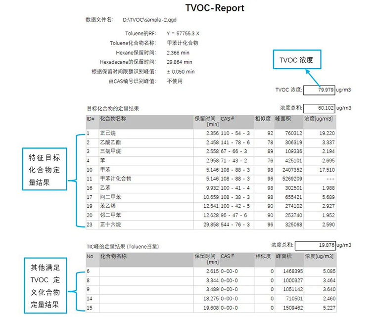 报告主画面上显示特征目标化合物的定量结果表、其他满足TVOC定义化合物定量结果表以及两部分浓度合计得到的TVOC浓度。