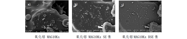 在使用扫描电镜对氧化铝陶瓷的微观形貌特征、孔隙结构和晶粒生长进行观察时,图1 a的氧化铝晶粒呈不规则块状形貌,晶粒尺寸从几百纳米至几十微米不等,b&c分别为二次电子像和背散射电子像,可以发现比起二次电子像突出形貌衬度,背散射电子像对于成分的区分更为明显,更易区分陶瓷主体和杂质。