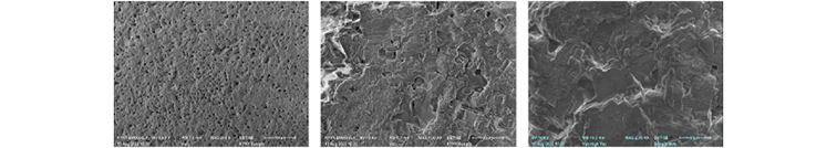 图3&4为使用扫描电镜拍摄的不同倍数的片状氧化铍陶瓷表面形貌,该氧化铍陶瓷用作行波管、回旋管等产品的绝缘散热安装零件和微波输出窗片,是真空器件不可或缺的基础材料。氧化铍基片在低倍下整体呈分布相对均匀的气孔结构(约为5%),高倍下观察是明显的片状层结构,形状多为方形,结构均匀,晶型发育较为完整。其中,陶瓷性能和气孔率有直接关系,气孔会使陶瓷的机械强度降低,热学性能、电学性能转劣、气密性变差等,使用扫描电镜可以清晰地观察到氧化铍陶瓷的气孔形貌,为工业材料的检测提供强有力的支撑。