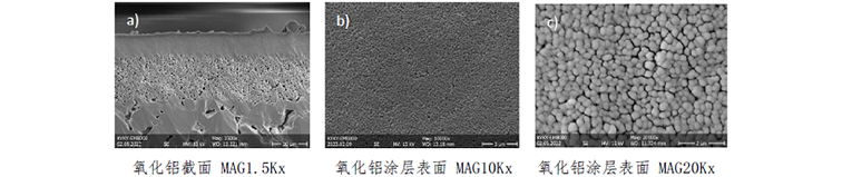 使用扫描电镜可以非常清晰观察到陶瓷的截面和表面结构。图2 a是陶瓷的截面形貌,氧化铝涂层位于上方表面,分层明显且粒径很小,b&c分别为低倍和高倍下观察的陶瓷表面,宏观上涂层表面较为平整,放大可以看出晶粒大小相对均匀,形状结构相对圆滑,圆度较高,晶粒尺寸在百纳米内,缝隙均匀。