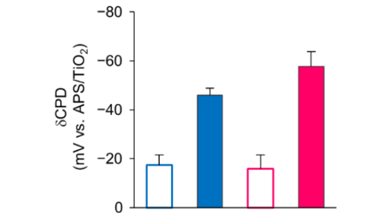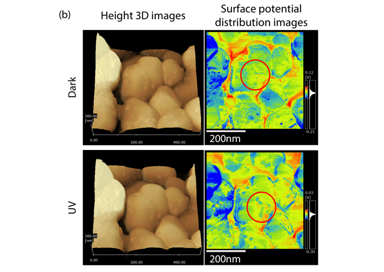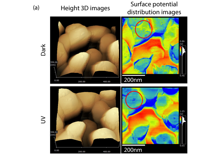 本实验通过在紫外光照射下通过KPFM测量表面电位分布,实现了固定在TiO2上的AuNP杂化物的光致电荷分布的可视化。这表明使用SPM的KPFM 模式,辅助以光照射单元可以有效地观察光催化是表面的电荷分离情况。